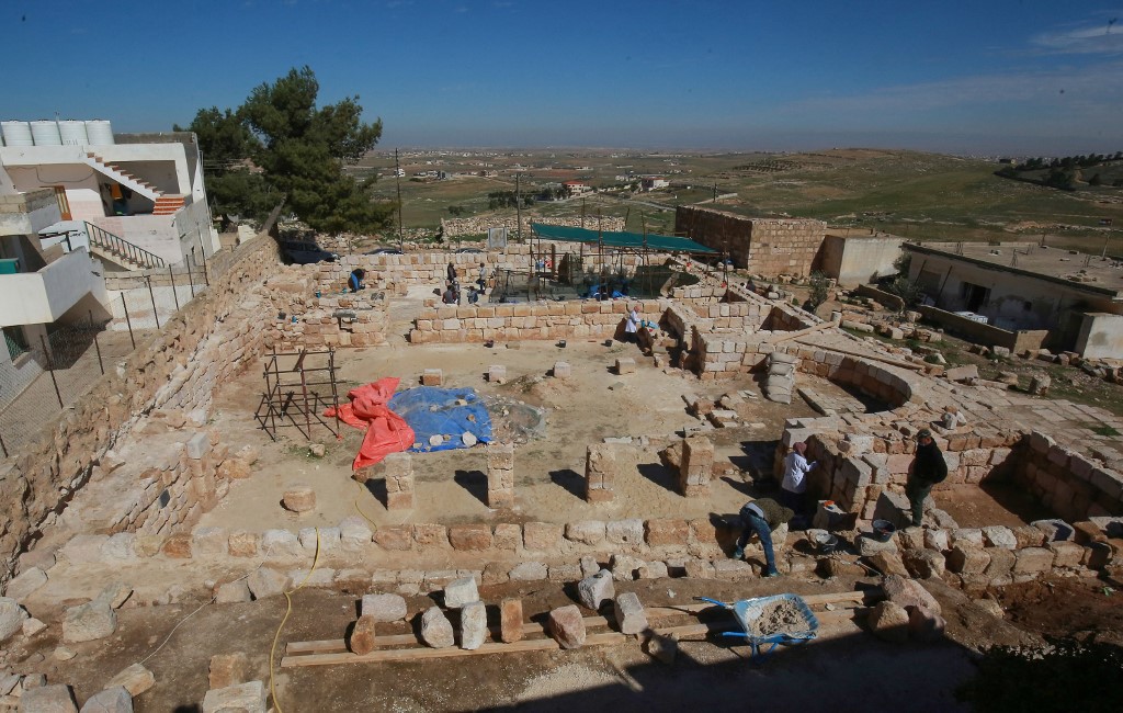 Workers employed by a pilot project run by the UN cultural agency UNESCO, restore a stone wall at an ancient church complex, in the small town of Rihab, some 70 kilometres north of the Jordanian capital Amman, on February 9, 2021. In the ruins of the ancient Byzantine church in Jordan, local townspeople and Syrian refugees work side by side on a project that unites preserving cultural heritage and fighting poverty.  Khalil MAZRAAWI / afp