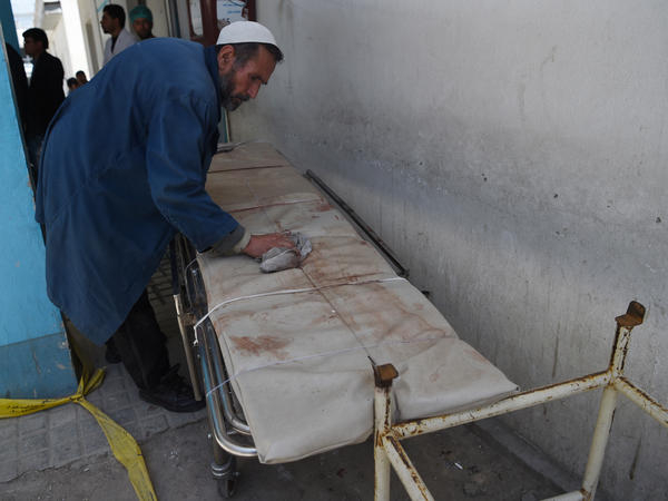 An Afghan medical staff member cleans a stretcher following a suicide bombing attack in Kabul on April 22, 2018. (AFP Photo/ Wakil Kohsar)