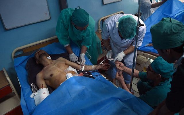 A wounded Afghan resident is treated following a suicide bombing attack at the Istiqlal Hospital in Kabul on April 22, 2018. (AFP Photo/ Wakil Koshor)