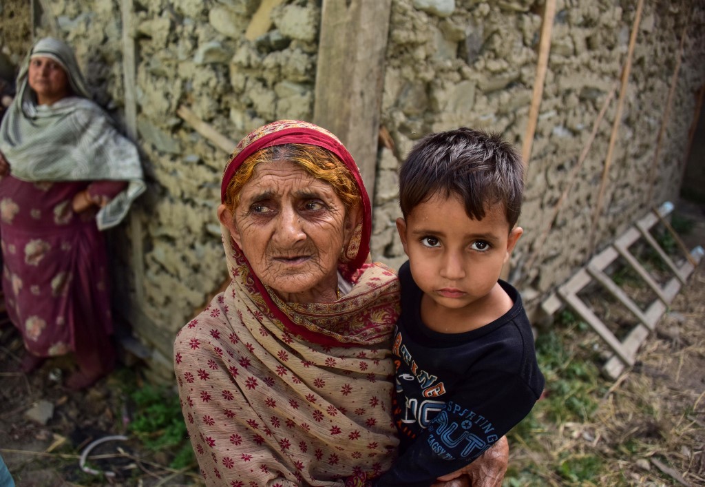 A Kashmiri woman holds a child as she looks on outside her damaged house following recently cross border shelling at the Line of Control, the de facto border between Pakistan and India, in Neelum Valley of Pakistan-administered Kashmir SAJJAD QAYYUM / AFP