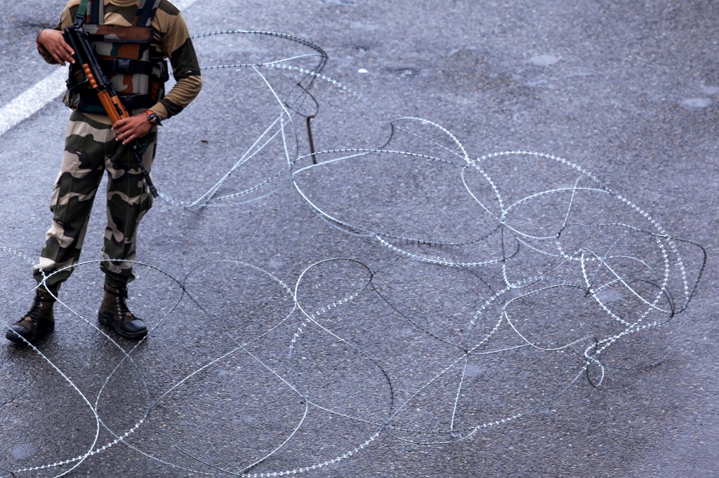 A security personnel stands guard at a roadblock during a curfew in Srinagar on August 6, 2019. India's home affairs minister on August 6 hailed "historic" legislation to bring Kashmir under its direct control, as New Delhi stepped up its clampdown on dissent in the restive Muslim-majority region. Tauseef MUSTAFA / AFP