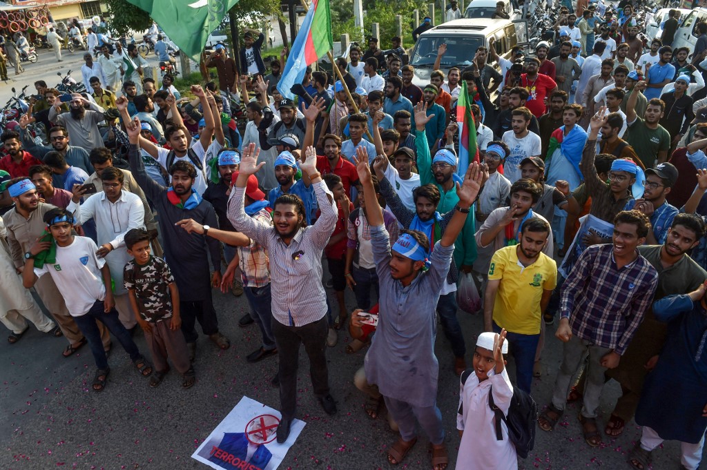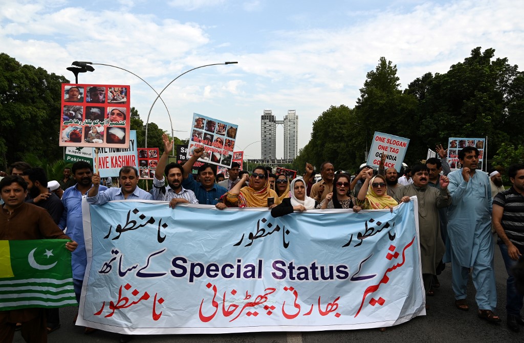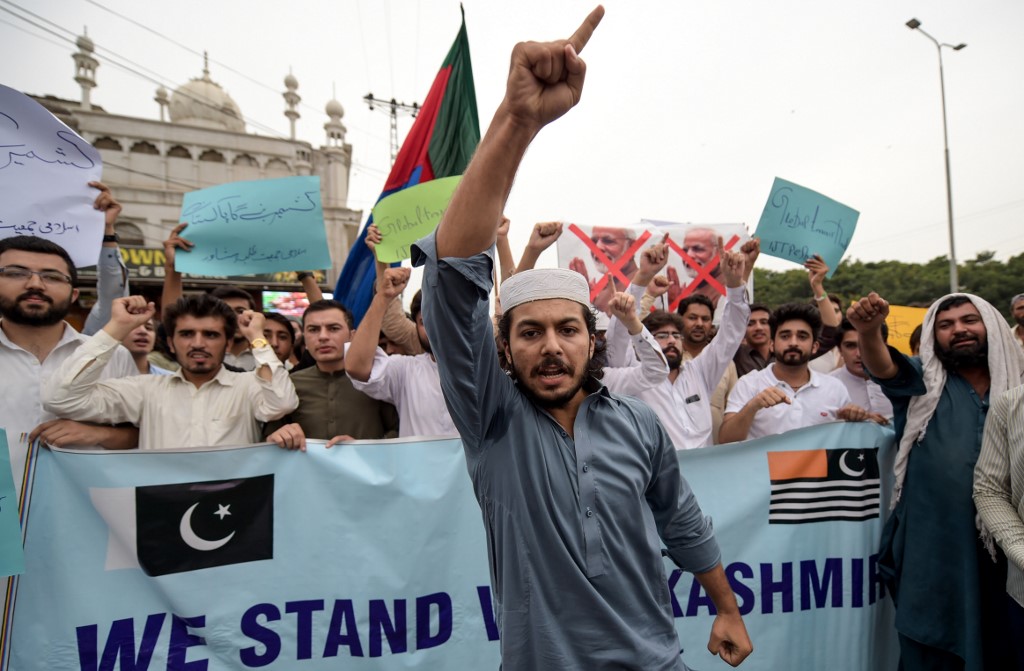 Pakistani Kashmiri people shout anti-Indian slogans during a demonstration in Islamabad on August 7, 2019. Pakistan's Prime Minister Imran Khan vowed to challenge at the UN security council India's decision to strip Kashmir of its special autonomy, a move he warned could provoke conflict in the region. AAMIR QURESHI / AFP