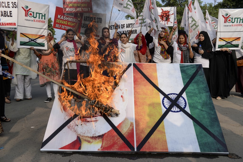 Activists of the 'Youth Forum for Kashmir' group shout slogans as they burn a picture of Indian Prime Minister Narendra Modi and the Indian flag during a protest in Lahore ARIF ALI / AFP