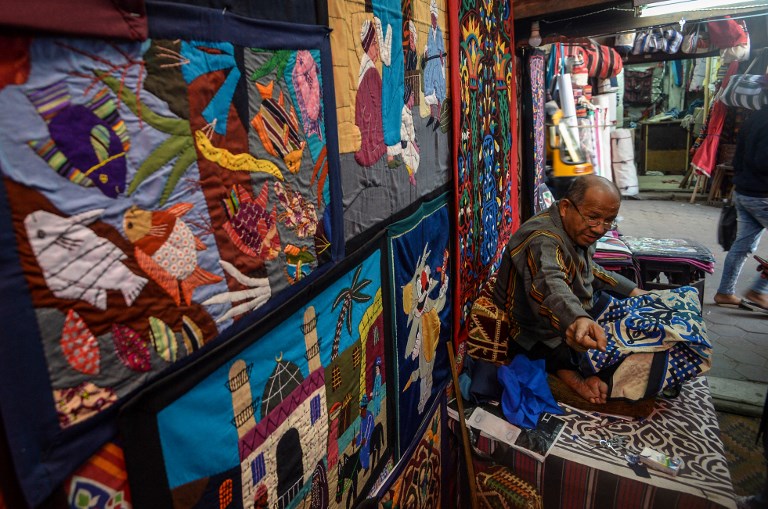 An Egyptian craftsman gestures as he sits while working on a tapestry in his shop in Khayamiya Street, or the Street of Tent-makers, in the old city of the Egyptian capital Cairo Mohamed el-Shahed / AFP
