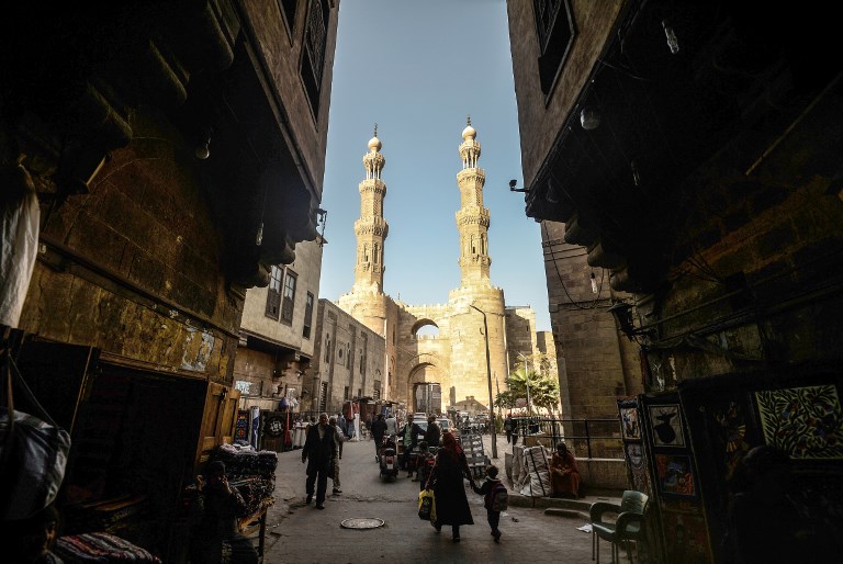 This picture shows a view from the entrance of Khayamiya Street, or the Street of Tent-makers, leading up to the 11th century Bab Zuweila, one of the surviving main gates of the old city of the Egyptian capital Cairo. Mohamed el-Shahed / AFP