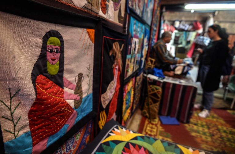 Customers walk in the shop of an Egyptian craftsman as he weaves a tapestry in his shop in Khayamiya Street, or the Street of Tent-makers, in the old city of the Egyptian capital Cairo on December 18, 2018. Mohamed el-Shahed / AFP