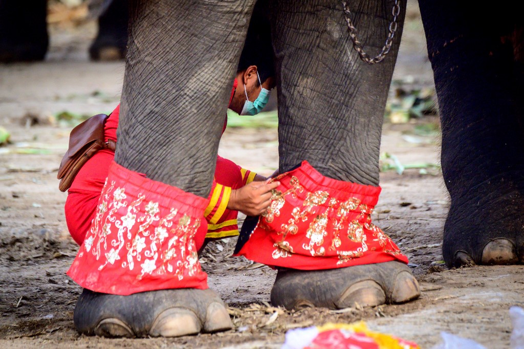 A mahout prepares his elephant for a ceremony and a festive breakfast of various fruits and vegetables to mark National Elephant Day at the Elephant Royal Kraal Village in Ayutthaya on March 13, 2021. Mladen ANTONOV / AFP