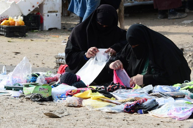 Displaced women sell clothing items in the souk or market of Al-Hol camp for displaced people in northeastern Syria GIUSEPPE CACACE / AFP