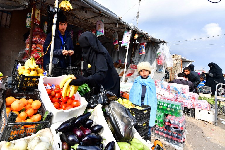 Displaced women buy vegetables and fruits in the souk or market of Al-Hol camp for displaced people in northeastern Syria GIUSEPPE CACACE / AFP