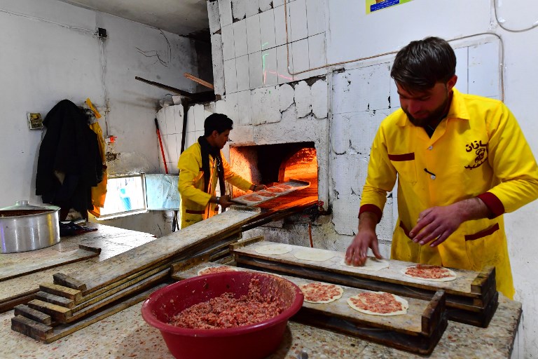 Bakers prepare local meat pies in the souk or market of Al-Hol camp for displaced people in northeastern Syria GIUSEPPE CACACE / AFP