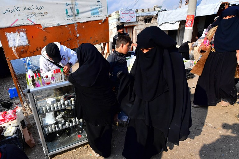 Women shop from a stall in the souk or market of Al-Hol camp for displaced people in northeastern Syria GIUSEPPE CACACE / AFP