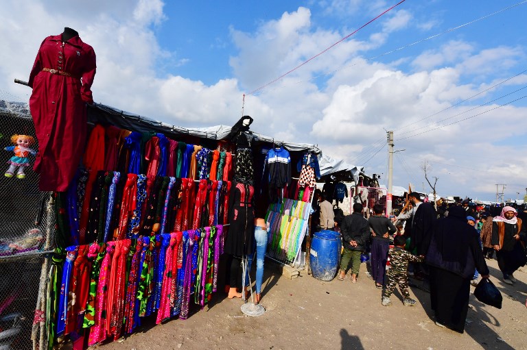 People walk past clothing stalls in the souk or market of Al-Hol camp for displaced people in northeastern Syria GIUSEPPE CACACE / AFP