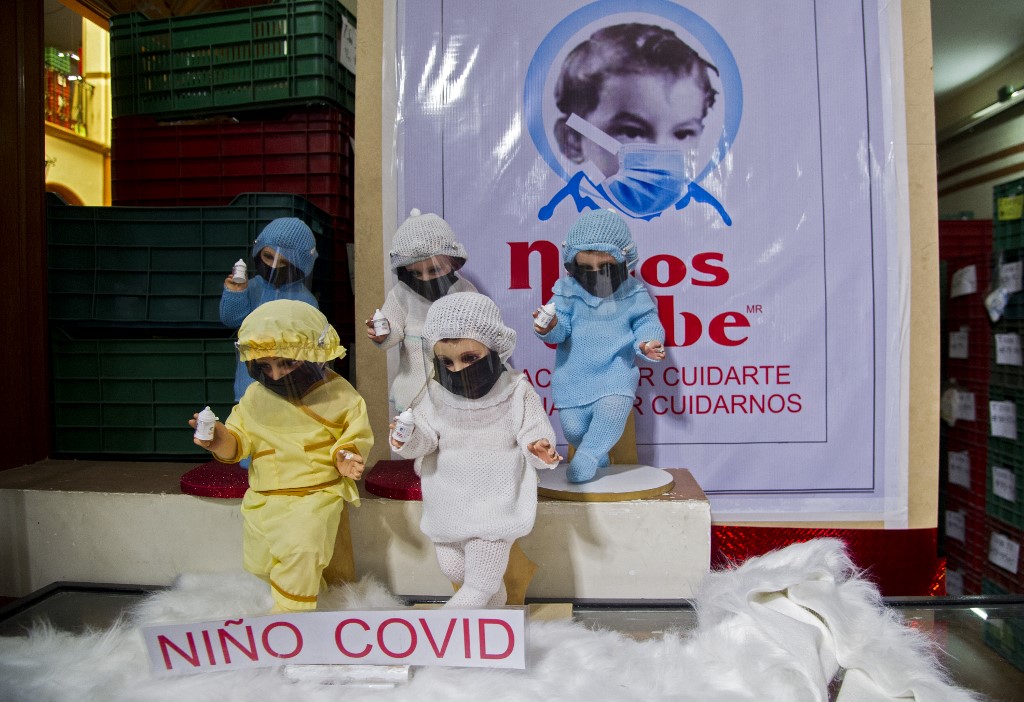 Mexico launches a set of baby Jesus dolls help raise awareness against Covid-19 in the country; the dolls appear in miniature face masks and clutching tiny bottles of hand sanitizer.