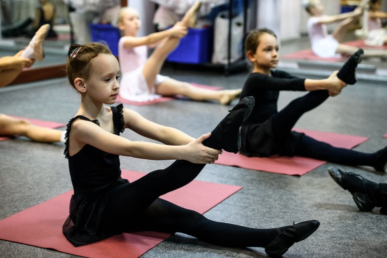 A girl attends a class at a ballet studio in Moscow on November 22, 2018. In a small studio in northern Moscow, parents and grandparents sit in a corridor waiting for children as young as three to finish their ballet class.