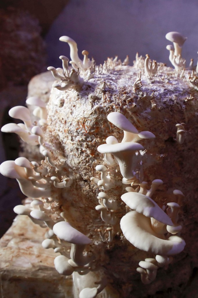 Before planting the fungi, they sterilize hay by stirring it in boiling water over a wood fire. Then they layer the wet straw into a bag, sprinkling five to ten grams of mushroom spores between each coating. Sealing the bag with a tight knot, they lug it into a dark, warm room and leaves it for around 20 days. Once the bag has turned white, they transfer it to a slightly brighter room, opens it up, and mists the top regularly until mushrooms sprout out.