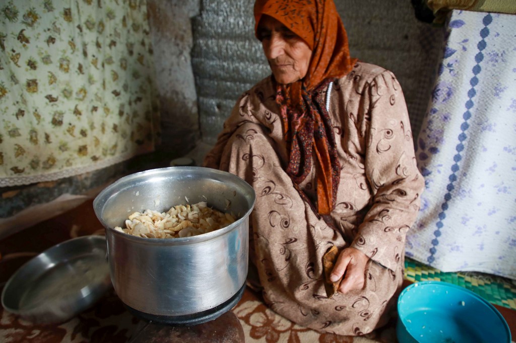 In a camp for the displaced in northern Syria, Nasrallah scatters mushroom spores into a bag of wet hay, hoping they will sprout and feed his family.