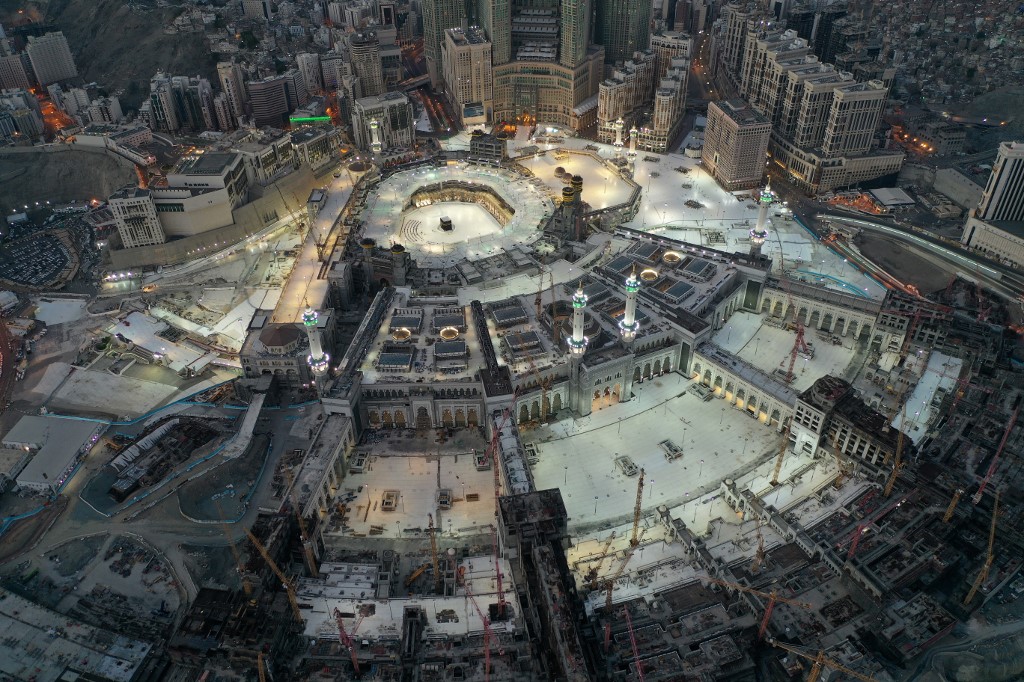 This picture taken on May 24, 2020 during the early hours of Eid al-Fitr, the Muslim holiday which starts at the conclusion of the holy fasting month of Ramadan, shows an aerial view of the Grand Mosque and Kaaba in the centre of Saudi Arabia's holy city of Mecca. Saudi Arabia began a five-day, round-the-clock curfew from May 23 after COVID-19 coronavirus infections more than quadrupled since the start of Ramadan to around 68,000 -- the highest in the Gulf. STR / AFP