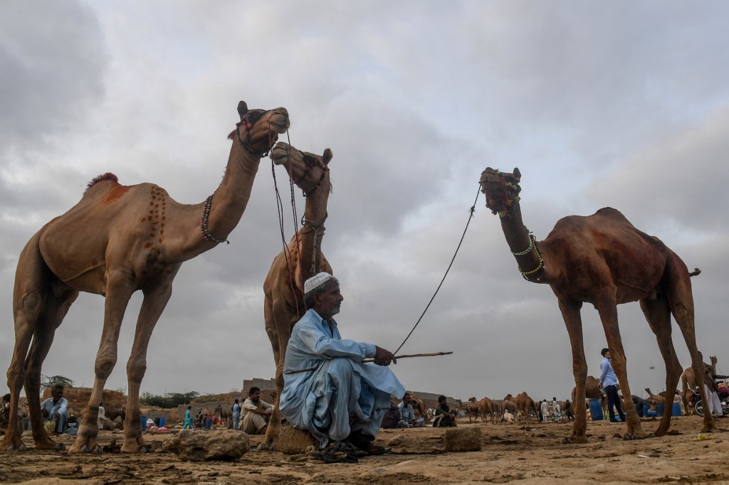 A livestock vendor sits along with camels as he waits for customers at a cattle market ahead of the Muslim festival Eid al-Adha or the 'Festival of Sacrifice', in the Pakistan's port city of Karachi on July 29, 2020. Asif HASSAN / AFP