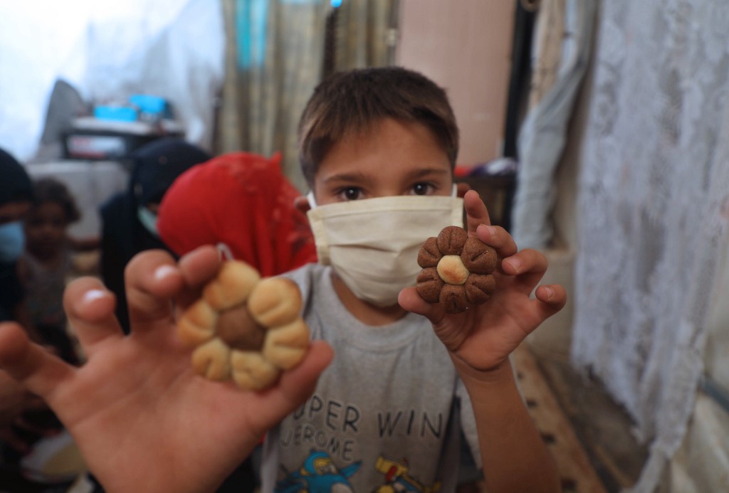 A displaced Syrian boy, wearing protective a face mask, displays cookies to the camera at a camp for the internally displaced near the town of Sarmada in Syria's northwestern Idlib province on July 29, 2020, as Muslims across the world are getting ready to celebrate Eid al-Adha. AAREF WATAD / AFP