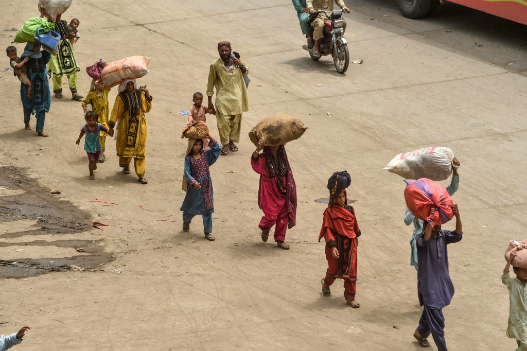 People carrying their belongings arrive at a bus station to go back home ahead of the Muslim festival Eid al-Adha or the 'Festival of Sacrifice' at a bus station in Lahore on July 30, 2020.  Arif ALI / AFP