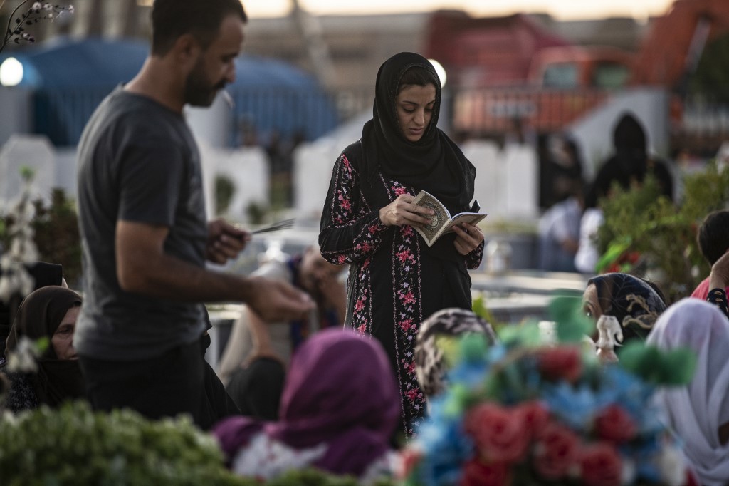 Relatives of a slain Kurdish fighter with the Syrian Democratic Forces (SDF), visit his tomb at a cemetery in the Kurdish-majority city of Qamishli of Syria's northeastern Hasakeh province, on the eve of the holy Muslim Feast of Sacrifice or Eid al-Adha on July 30, 2020. Delil SOULEIMAN / AFP