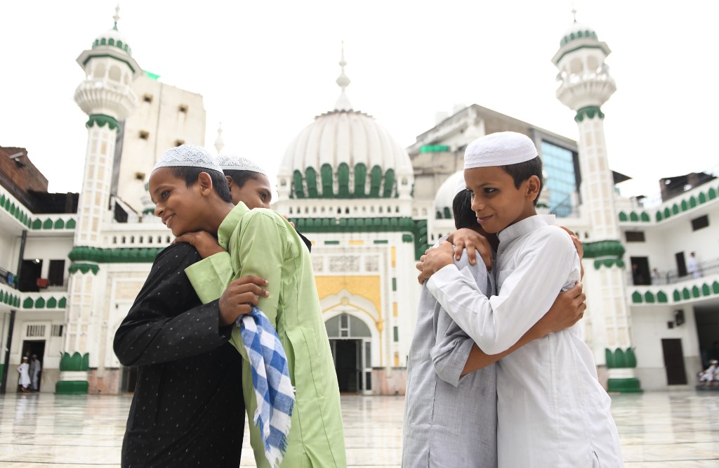 Muslim devotees greet each other after offering a special morning prayer on the occasion of Eid al-Adha, the feast of sacrifice, at the Jama Masjid Khairuddin in Amritsar on August 1, 2020. NARINDER NANU / AFP