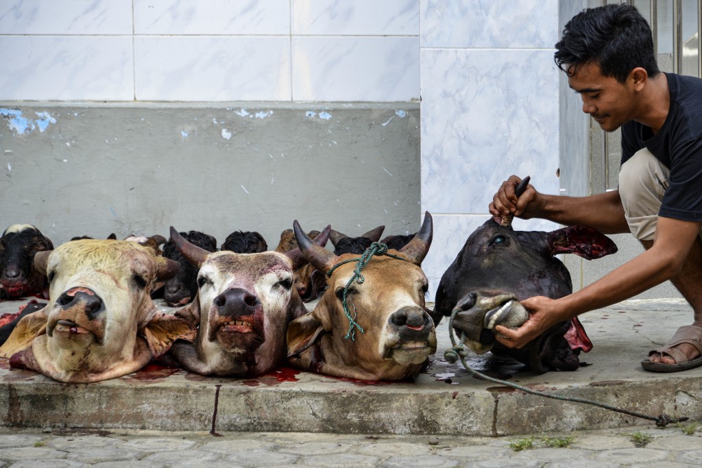 A man checks a cow's head after slaughtering it during the sacrificial Eid al-Adha festival in Banda Aceh on August 1, 2020. CHAIDEER MAHYUDDIN / AFP
