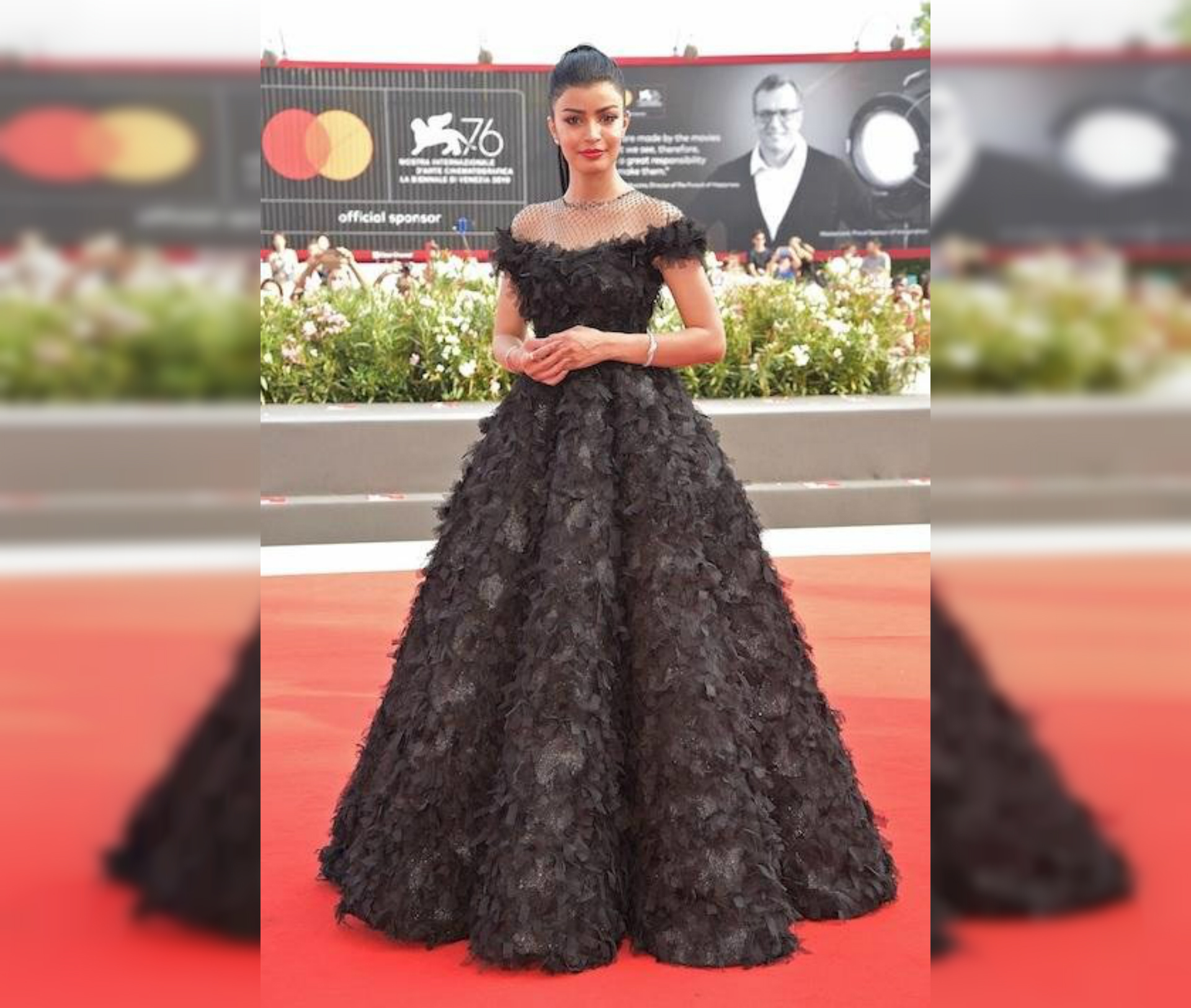 Saudi actress Mila Al Zahrani sported a black gown with feathers for her first look