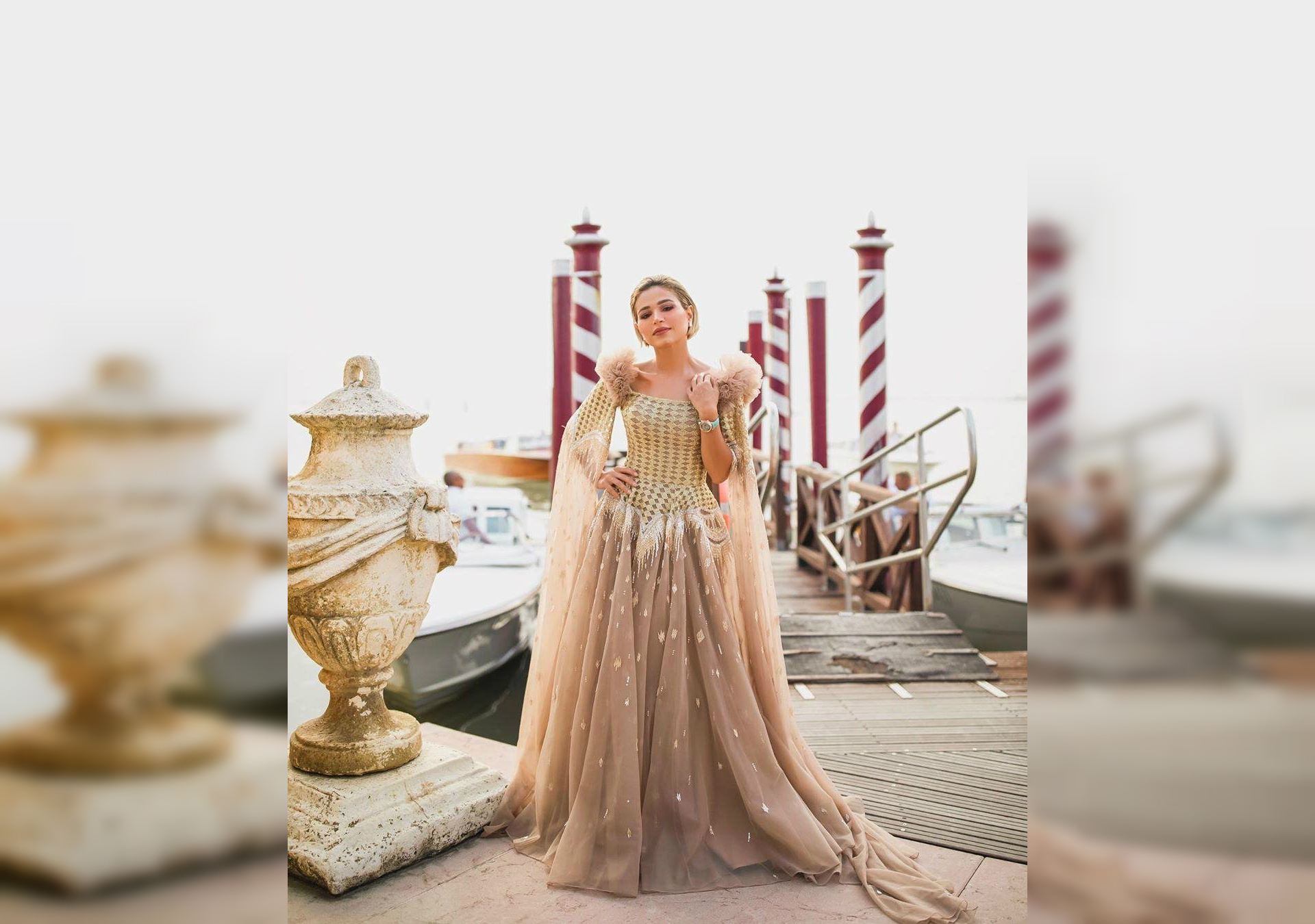 Kuwaiti poet and TV personality Noha Nabil dazzled in a golden dress by fashion house LaBourjoisie