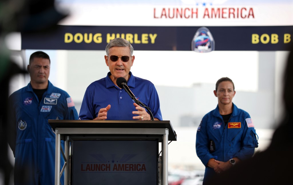 Kennedy Space Center Director Bob Cabana speaks about the weather outlook during a pre-launch briefing at the Kennedy Space Center in Florida on May 29, 2020. The SpaceX Falcon 9 rocket (rear) with the Crew Dragon capsule is rescheduled to launch to the International Space Station on May 30, carrying astronauts Bob Behnken and Doug Hurley. Gregg Newton / AFP