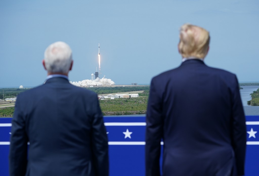 President Donald Trump (L) Second Lady Karen Pence (C) Vice President Mike Pence (R) watch from the rooftop of the Operational Building at NASA during the launch of the SpaceX Falcon 9 rocket with NASA astronauts Bob Behnken (R) and Doug Hurley aboard the rocket from the Kennedy Space Center on May 30, 2020 in Cape Canaveral, Florida. The inaugural flight is the first manned mission since the end of the Space Shuttle program in 2011 to be launched into space from the United States. Saul Martinez/Getty Images/AFP