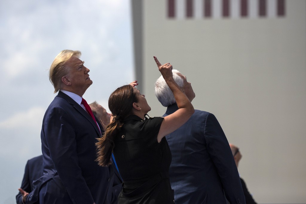 US President Donald Trump watches the SpaceX Falcon 9 rocket carrying the SpaceX Crew Dragon capsule, with astronauts Bob Behnken and Doug Hurley, lifts off from Kennedy Space Center in Florida on May 30, 2020. Trump travels to Kennedy Space Center in Florida to watch the launch of the manned SpaceX Demo-2 mission to the International Space Station. MANDEL NGAN / AFP