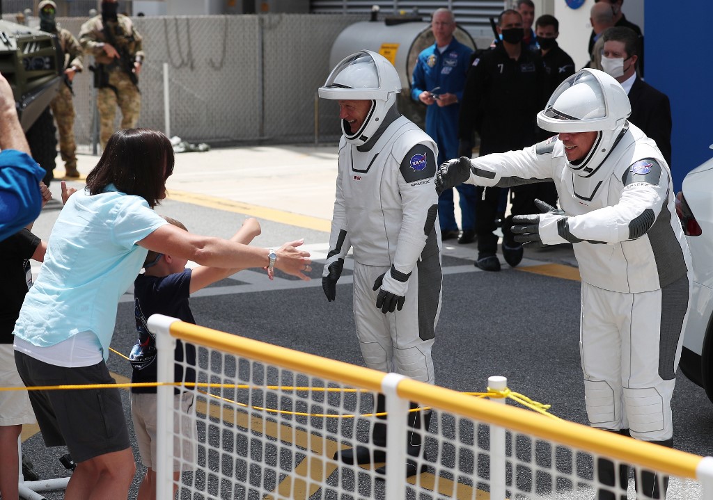 NASA astronauts Bob Behnken (R) and Doug Hurley say goodbye to family members after walk ing out of the Operations and Checkout Building on their way to the SpaceX Falcon 9 rocket with the Crew Dragon spacecraft on launch pad 39A at the Kennedy Space Center on May 30, 2020 in Cape Canaveral, Florida. The inaugural flight will be the first manned mission since the end of the Space Shuttle program in 2011 to be launched into space from the United States. Joe Raedle/Getty Images/AFP