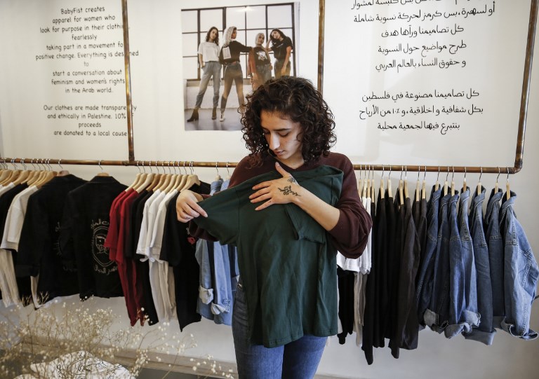 Yasmeen Mjalli, 22 is "BabyFist" label founder. She sees the clothes as helping empower Palestinian women facing unwelcome male attention in public. In August 2017, she launched her first collection and a few months later opened the Ramallah shop to complement her existing online sales.