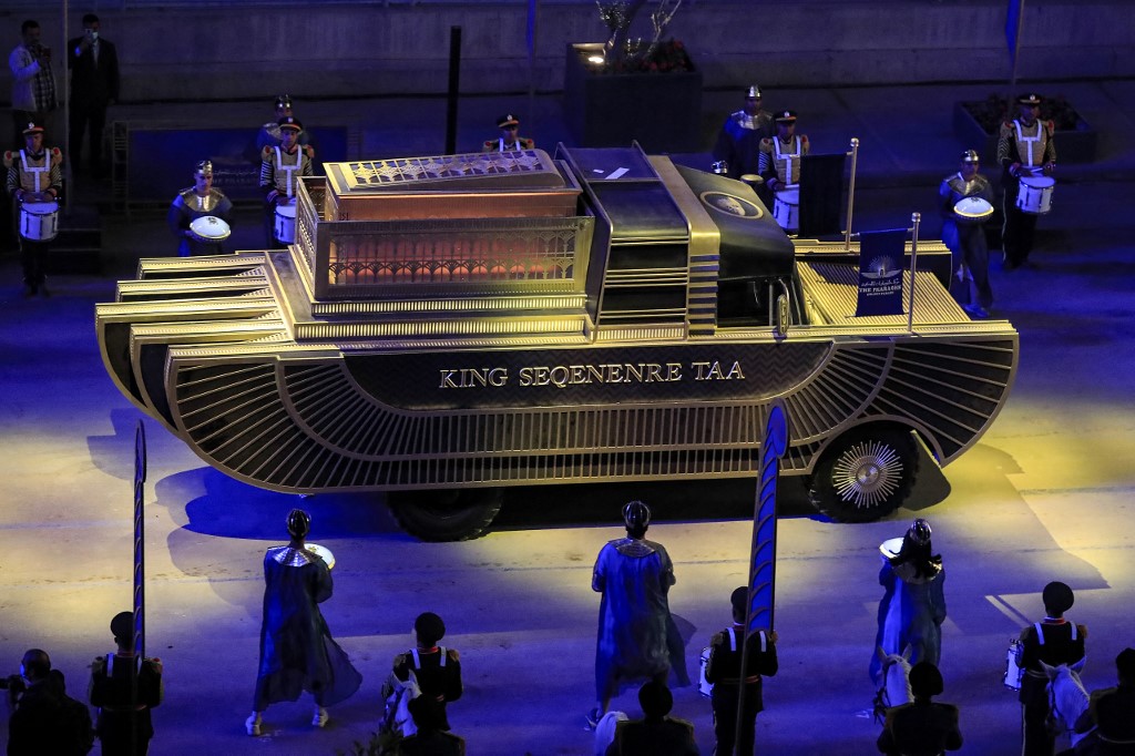 The carriage carrying the mummy of Pharaoh Seqenenre Tao II (1558–1555 BC) advances as part of the parade of 22 ancient Egyptian royal mummies departing from the Egyptian Museum in Cairo's Tahrir Square on April 3, 2021, on their way to their new resting place at the new National Museum of Egyptian Civilisation (NMEC) about seven kilometres south in historic Fustat (Old Cairo). Dubbed the Pharaohs' Golden Parade, the 18 kings and four queens will travel in order, oldest first, each aboard a separate float decorated in ancient Egyptian style. Khaled DESOUKI / AFP