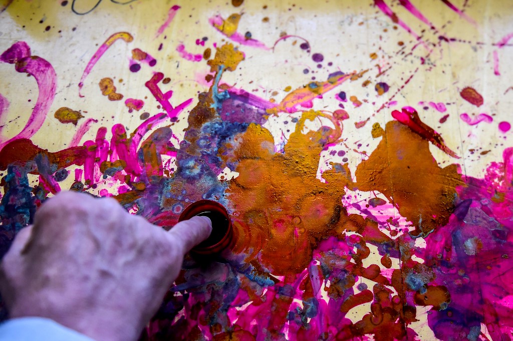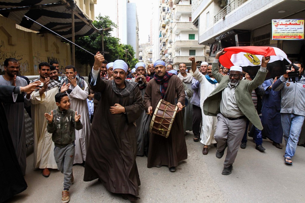 An Egyptian man dances with a national flag as others play musical instruments while walking in a procession outside a school in the second city of Alexandria, during voting in a referendum on constitutional amendments. Tarek ABDEL HAMID / AFP
