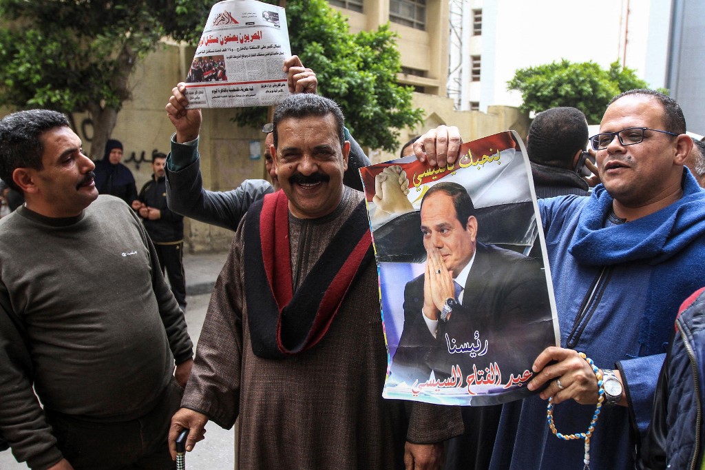Egyptians pose for a picture with a newspaper front page and a poster of President Abdel Fattah al-Sisi outside a school in the second city of Alexandria during voting in a referendum on constitutional amendments on the first day of the three-day poll, on April 20, 2019. Tarek ABDEL HAMID / AFP