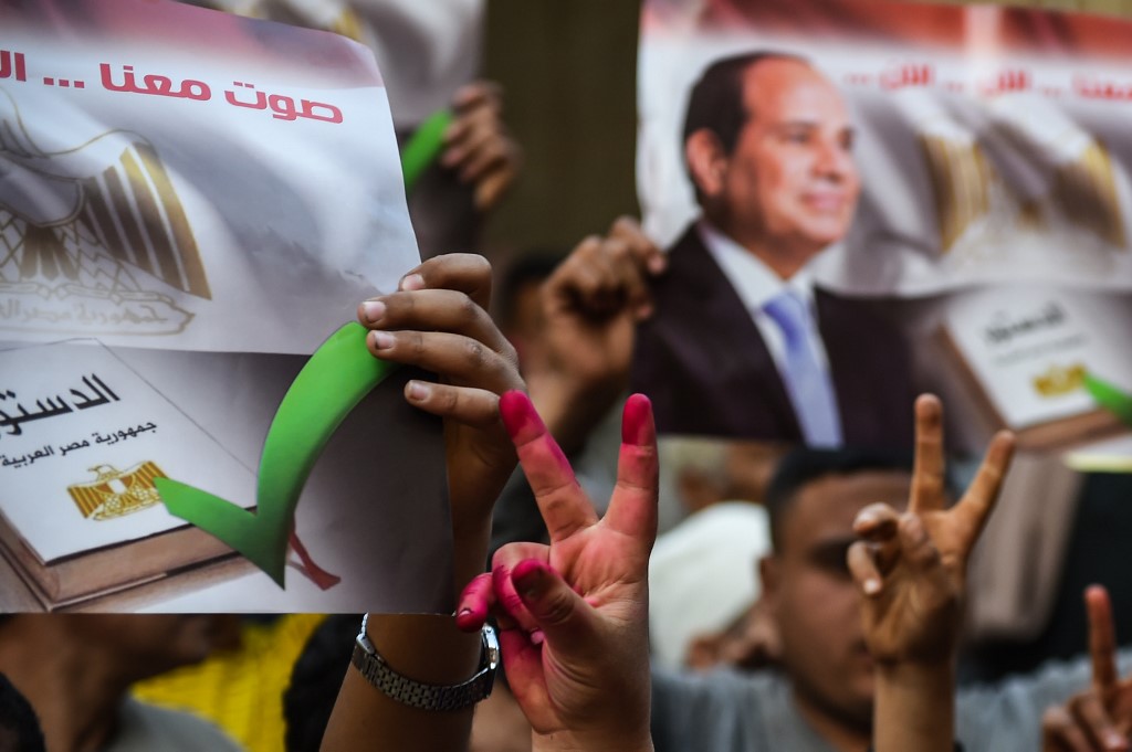 Egyptian people show their inked hands after voting at a polling station during the third day of a referendum on constitutional amendments, at a school in shamma village in the northern Nile delta province of Menoufia, on April 22, 2019. Mohamed el-Shahed / AFP