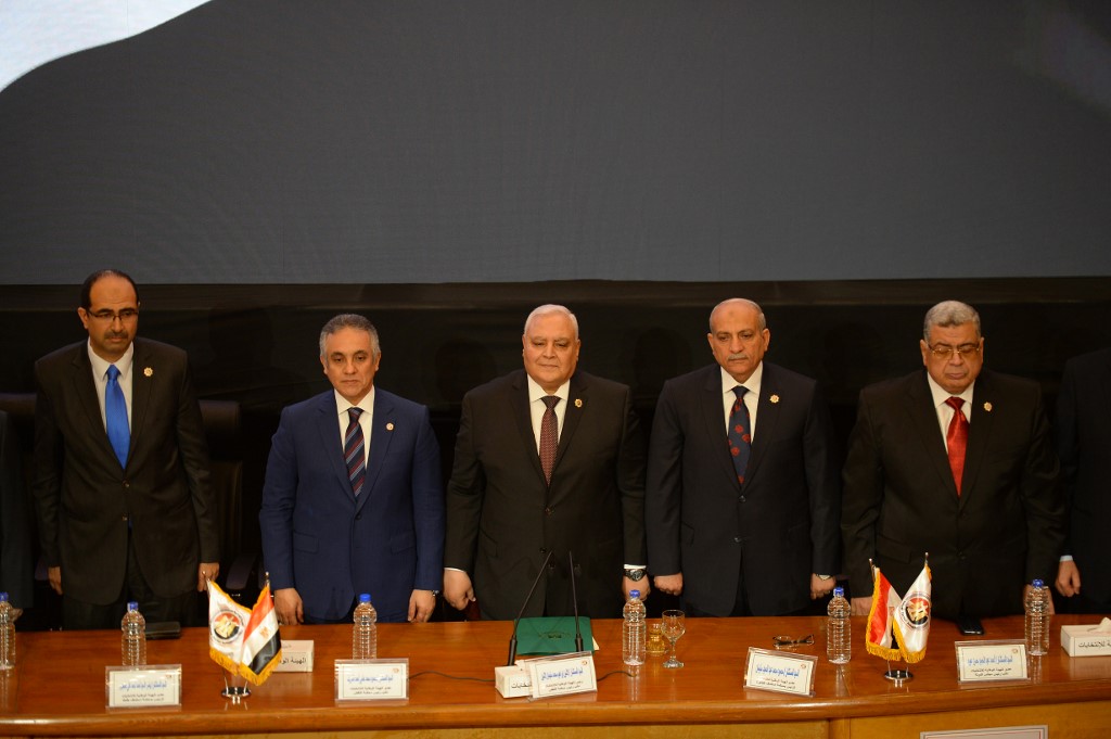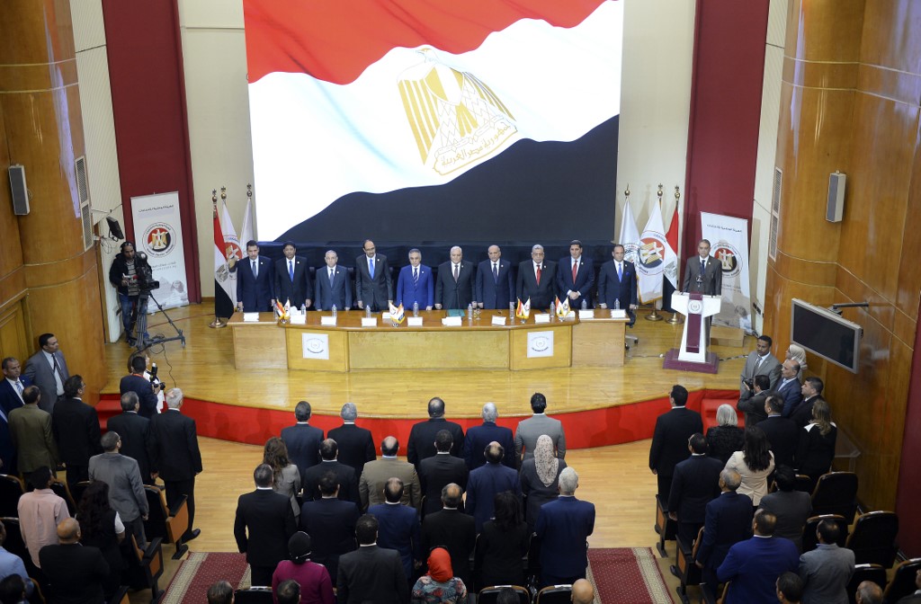 Members of the National Elections Commission (NEC) pose for a picture during a press conference in the Egyptian capital Cairo on April 23, 2019 to announce the result of the referendum extending the rule of President Abdel Fattah al-Sisi. Egypt referendum extending Sisi rule passed with 88.83% of vote. MOHAMED EL-SHAHED / AFP
