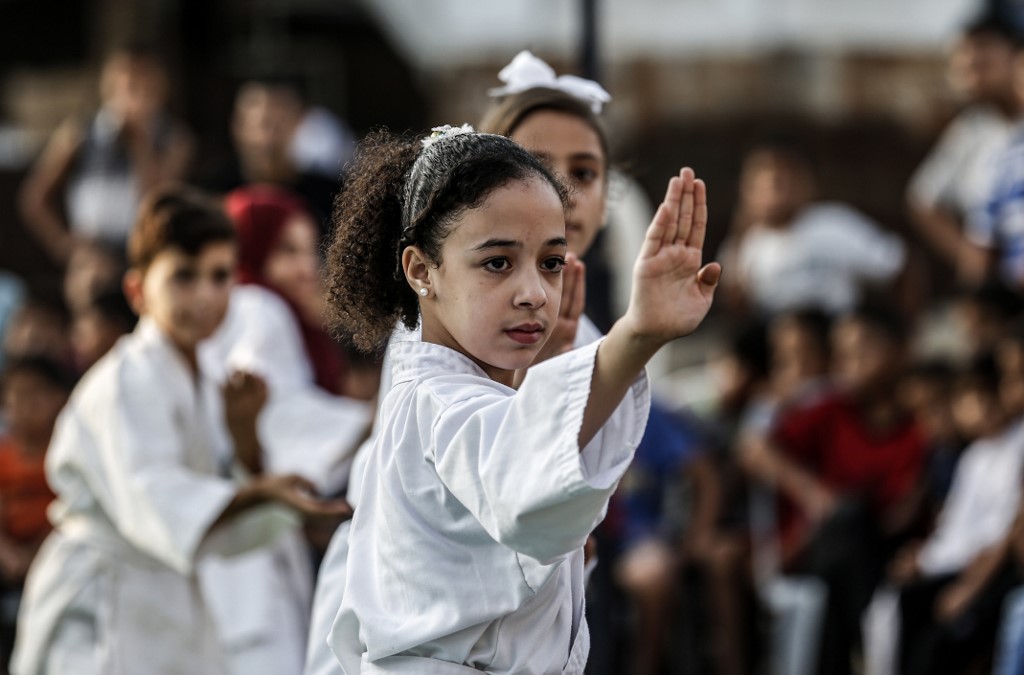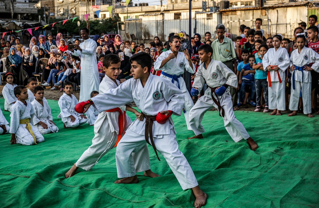 Young Palestinian karatekas demonstrate their skills during a Karate promotion ceremony at a sporting center in the Rafah camp for Palestinian refugees in the southern Gaza Strip.