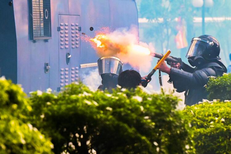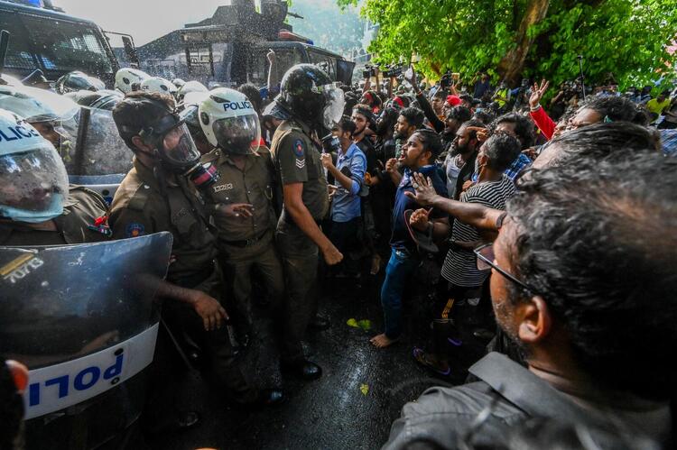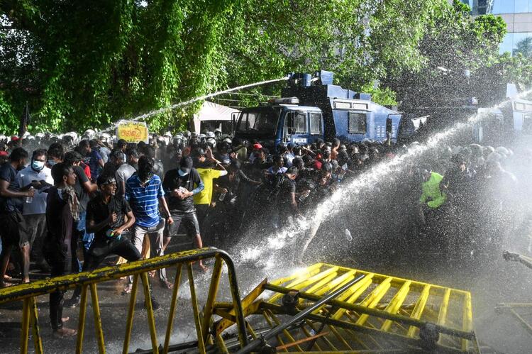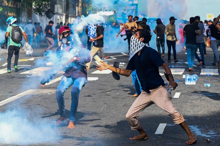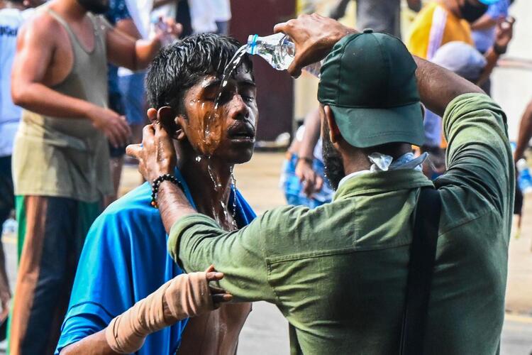A demonstrators tries to douse a tear gas canister fired by police to disperse Higher National Diploma (HND) students protesting to demand the resignation of Sri Lanka's President Gotabaya Rajapaksa over the country's crippling economic crisis, in Colombo on May 21, 2022. (Photo by ISHARA S. KODIKARA / AFP)