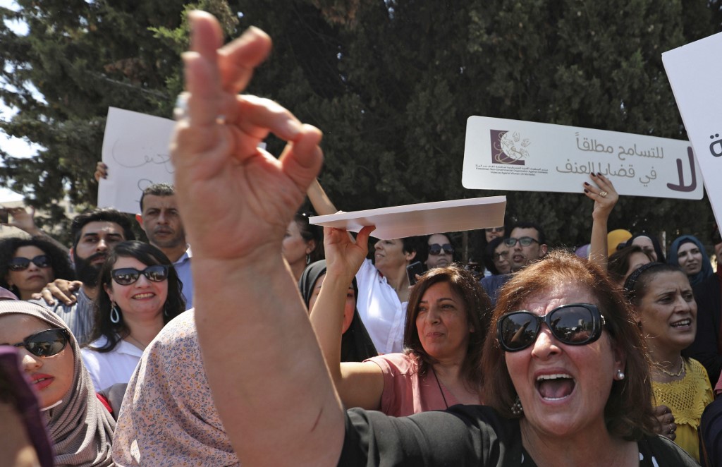 Palestinian women protest in support of women’s rights outside the prime minister’s office in the West Bank city of Ramallah on September 2, 2019, after a young Palestinian died in a case that has raised emotions.  ABBAS MOMANI / AFP