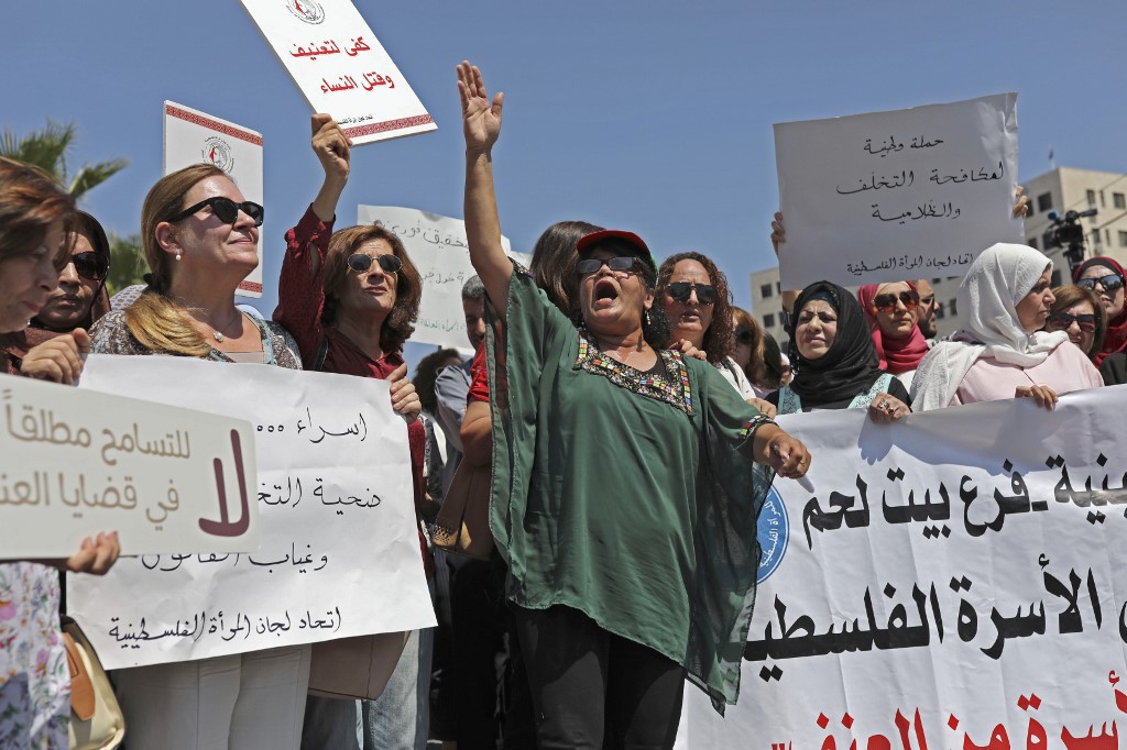 Palestinian women protest in support of women’s rights outside the prime minister’s office in the West Bank city of Ramallah on, after a young Palestinian died in a case that has raised emotions. ABBAS MOMANI / AFP