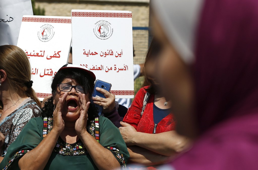 Palestinian women protest in support of women’s rights outside the prime minister’s office in the West Bank city of Ramallah on, after a young Palestinian died in a case that has raised emotions.  ABBAS MOMANI / AFP