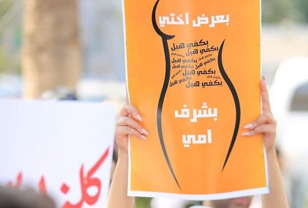 Arabic slogans on placards call for an end to violence against women and introducing a law for family protection against domestic violence."  (Twitter)