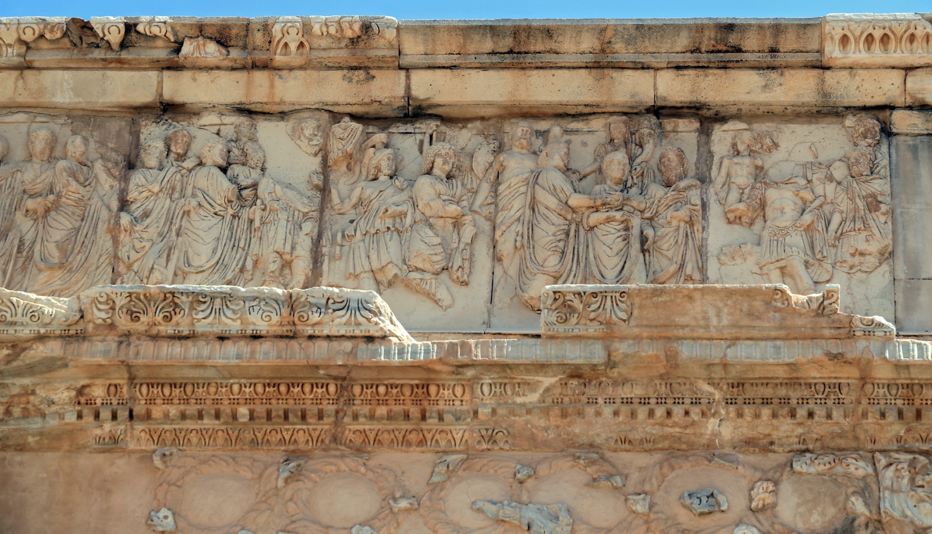 A picture shows a view of a carved frieze at the ancient Roman city of Leptis Magna near the coastal Libyan city of Al-Khums, 120Km east of the capital, on August 24, 2021.(Photo by Mahmud TURKIA / AFP)