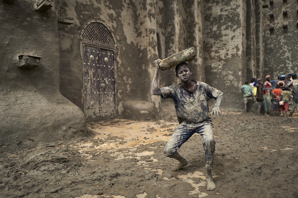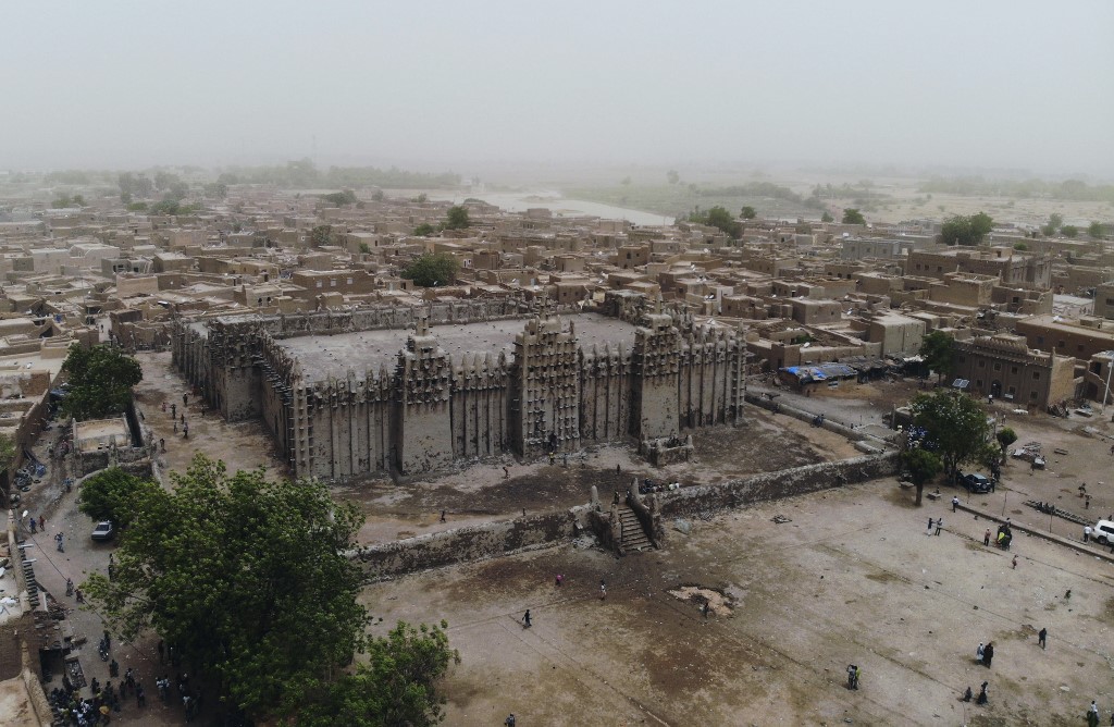 The rendering of the building with banco (a mixture of soil and water, with rice bran, shea butter and baobab powder) made by the city's inhabitants, helps to protect the mosque from bad weather ahead of the rainy season. The Grand Mosque in the Malian city of Djenne described as “the largest adobe [clay] building in the world”.