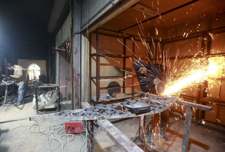 Labourers take part in restoration work at the Saqatiya market in the old quarter of Syria's second city of Aleppo LOUAI BESHARA / AFP