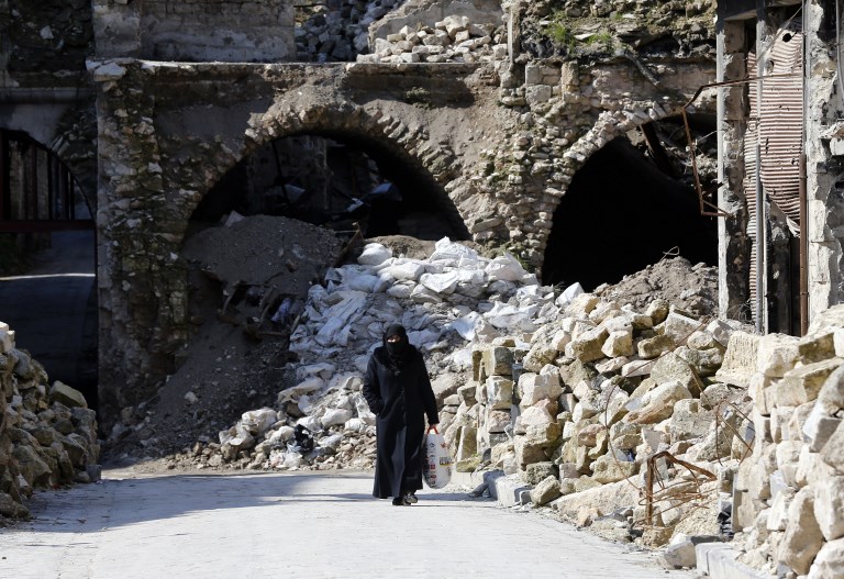 A general view shows a woman walking past debris in the old quarter of Syria's second city of Aleppo LOUAI BESHARA / AFP