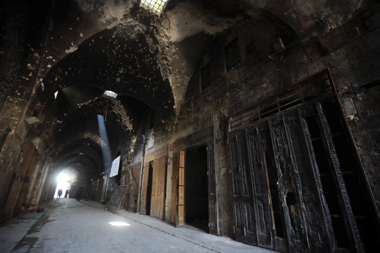 A general view shows the damaged inflicted on the Old Aleppo markets in the old quarter of Syria's second city of Aleppo LOUAI BESHARA / AFP